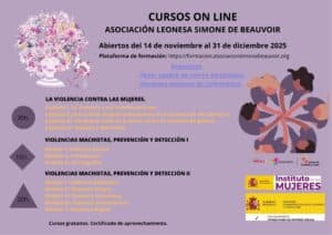 En noviembre abrimos en nuestra plataforma de formación: https://formacion.asociacionsimonebeauvoir.org , tres cursos on line que se pueden realizar de forma simultánea donde se abordan diferentes aspectos sobre la violencia de género. “LA VIOLENCIA CONTRA LAS MUJERES”. Capítulo I. La violencia y sus manifestaciones.Capítulo II ¿Por qué las mujeres permanecen en