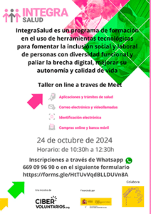 Dirigido a personas con discapacidad. Sácale partido a la tecnología para cuidar tu salud. Te puedes inscribir en el siguiente enlace https://docs.google.com/forms/d/19bJhWwRWVmNU1XQQQcLeouIT-d04aNkzAZXLaLDHik0/edit?pli=1